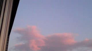 この夕暮れを撮って反対の東側を向いたら、犬が飛んでいるような形になった雲がいた。どうかな、犬に見えない?